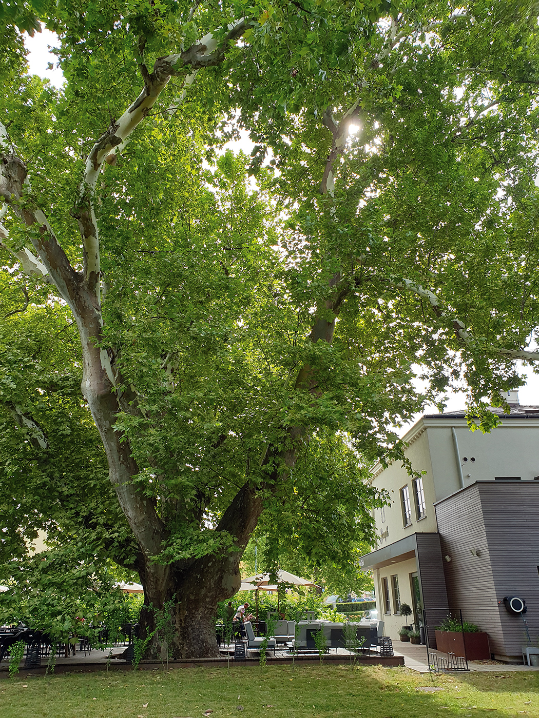 Die Ahornblättrige Platane (Platanus x hispanica) in Bruckneudorf steht seit 1949 als Naturdenkmal unter Schutz und zeichnet sich durch eine sehr imposante, ausladende Wuchsform aus. Der 32 Meter hohe Baum erreicht in Brusthöhe einen Stammumfang von mehr als 5 Metern. Heute sind zwei der ehemals gesicherten Äste abgestorben und haben Höhlungen ausgebildet. In diesen Baumhöhlen lebt der Große Abendsegler (Nyctalus noctula), eine der größten heimischen Fledermausarten. Alte Spechtlöcher werden von Eurasischen Eichhörnchen (Sciurus vulgaris) besiedelt. Bei der fachgerechten Baumpflege wird auf die Tiere Rücksicht genommen und versucht, die Baumhöhlen langfristig als Lebensraum zu erhalten.